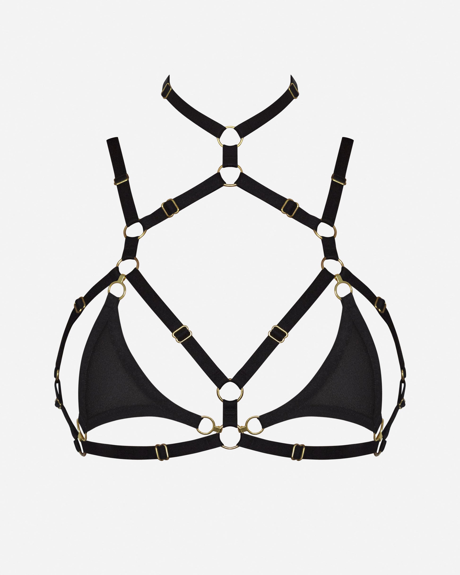 ALEXA Strap Collar Bra by ROSANELLY™ is a body harness made entirely of elastic satin strapping and 24k gold plated hardware. It come with optional cups. It looks perfect on its own or with your favourite ROSANELLY lingerie underneath.