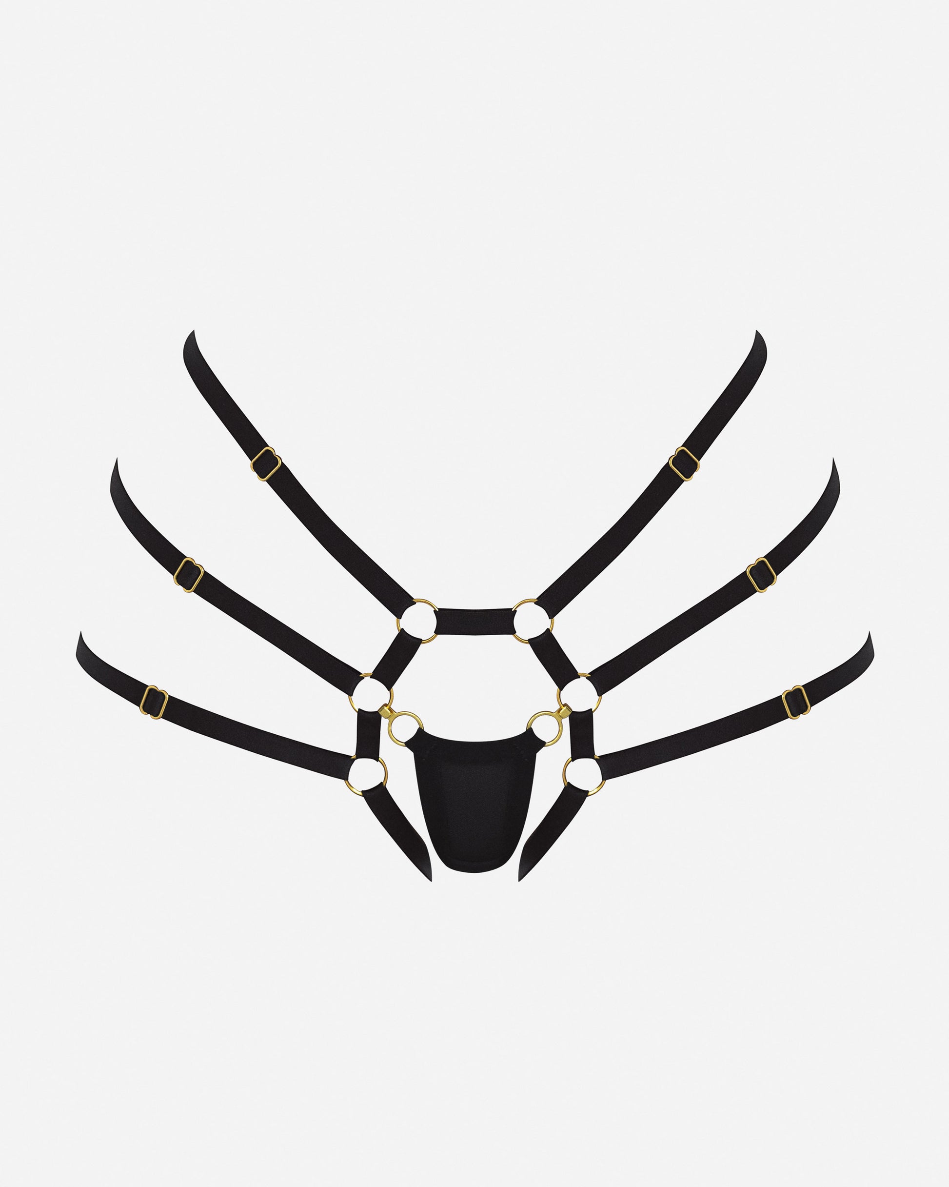 ALEXA Strap Panty by ROSANELLY™ is a body harness made entirely of elastic satin strapping and 24k gold plated hardware. It looks perfect on its own or with your favourite ROSANELLY™ lingerie underneath.