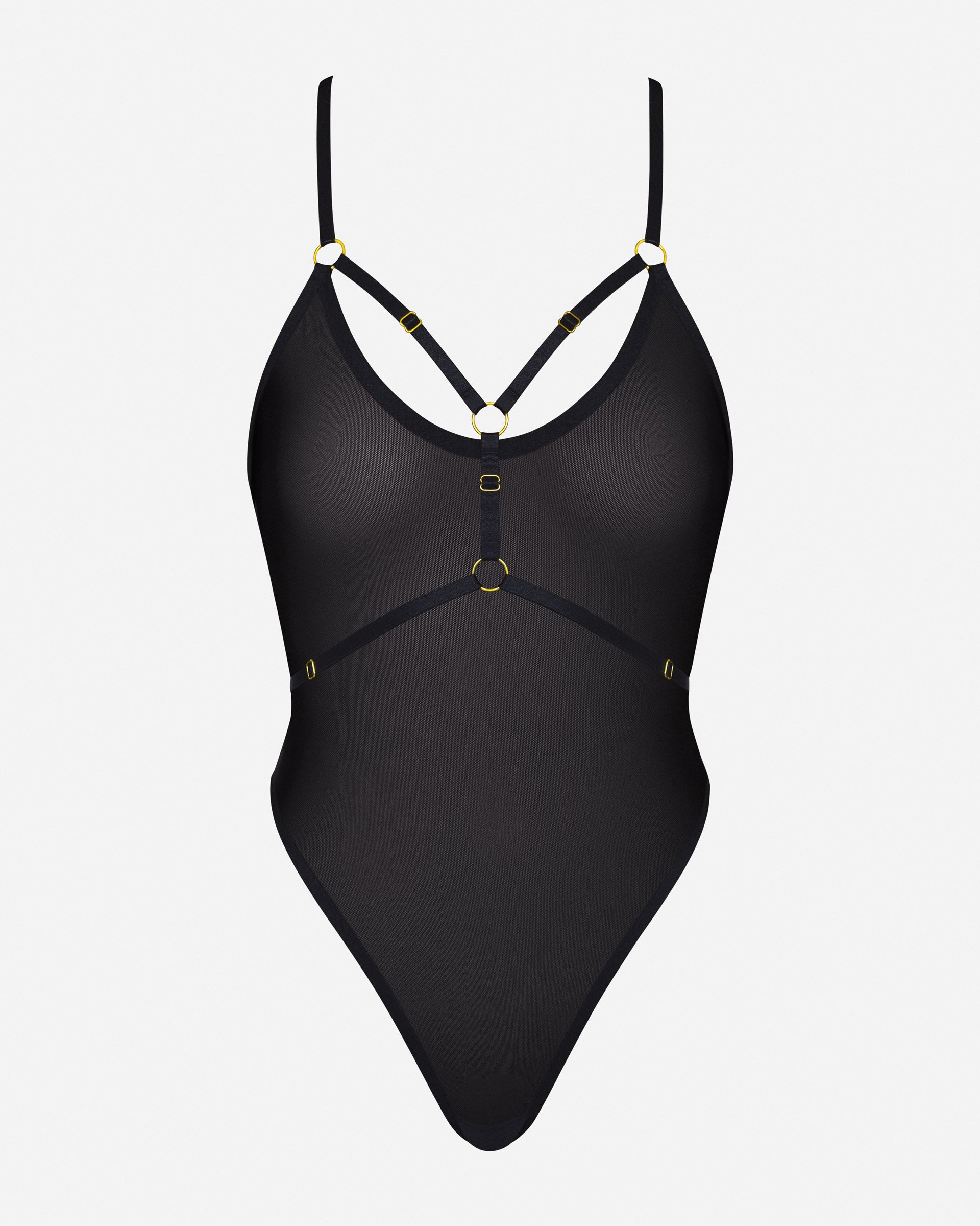 ELSA Strap Bodysuit by ROSANELLY™  is a super sexy bodysuit made up of ultra soft mesh and satin strapping combined with 24k gold plated hardware. Adjustable with gold plated sliders.