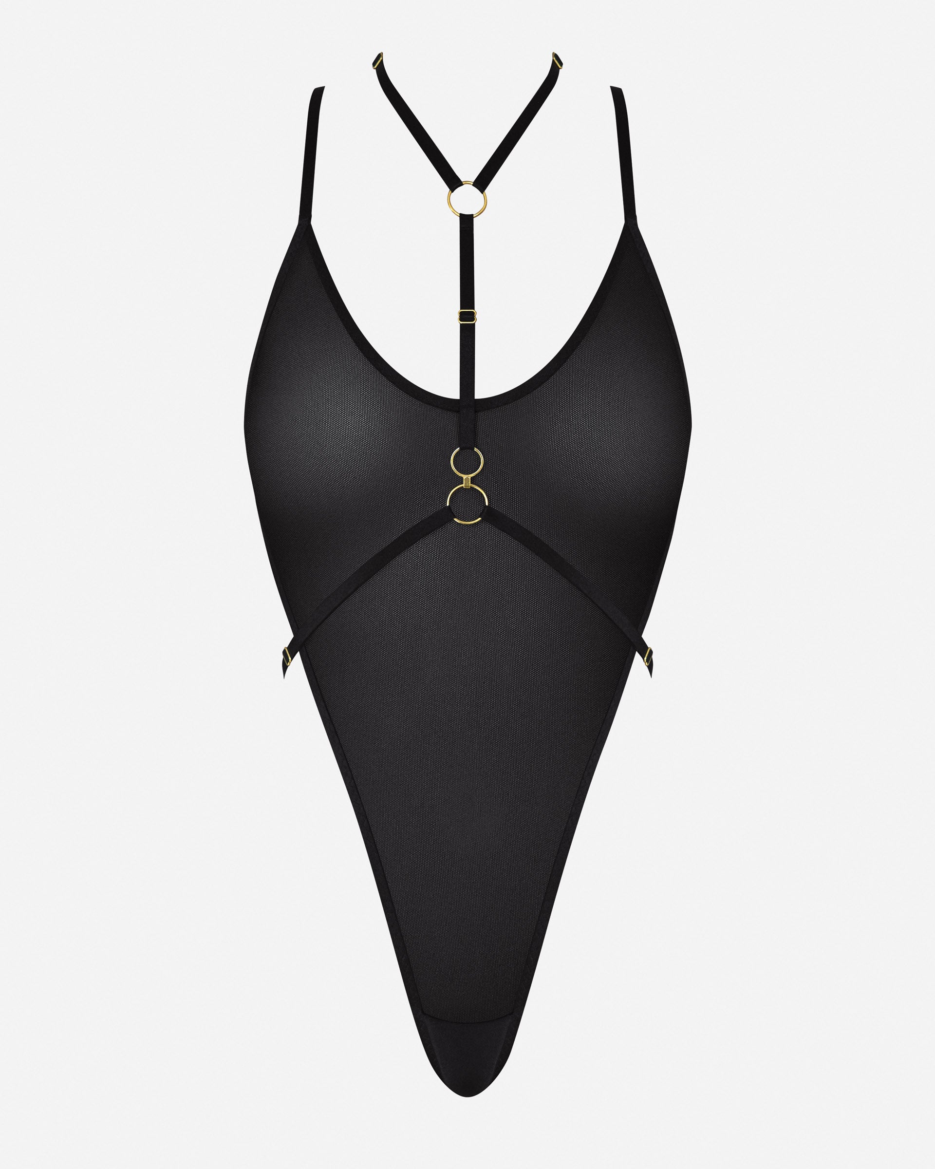 KIMI Bodysuit by ROSANELLY™  is a super sexy bodysuit made up of soft mesh and satin strapping combined with 24k gold plated hardware. It comes with an optional harness collar. Fully adjustable, fits all sizes between XS-XL with gold plated sliders.