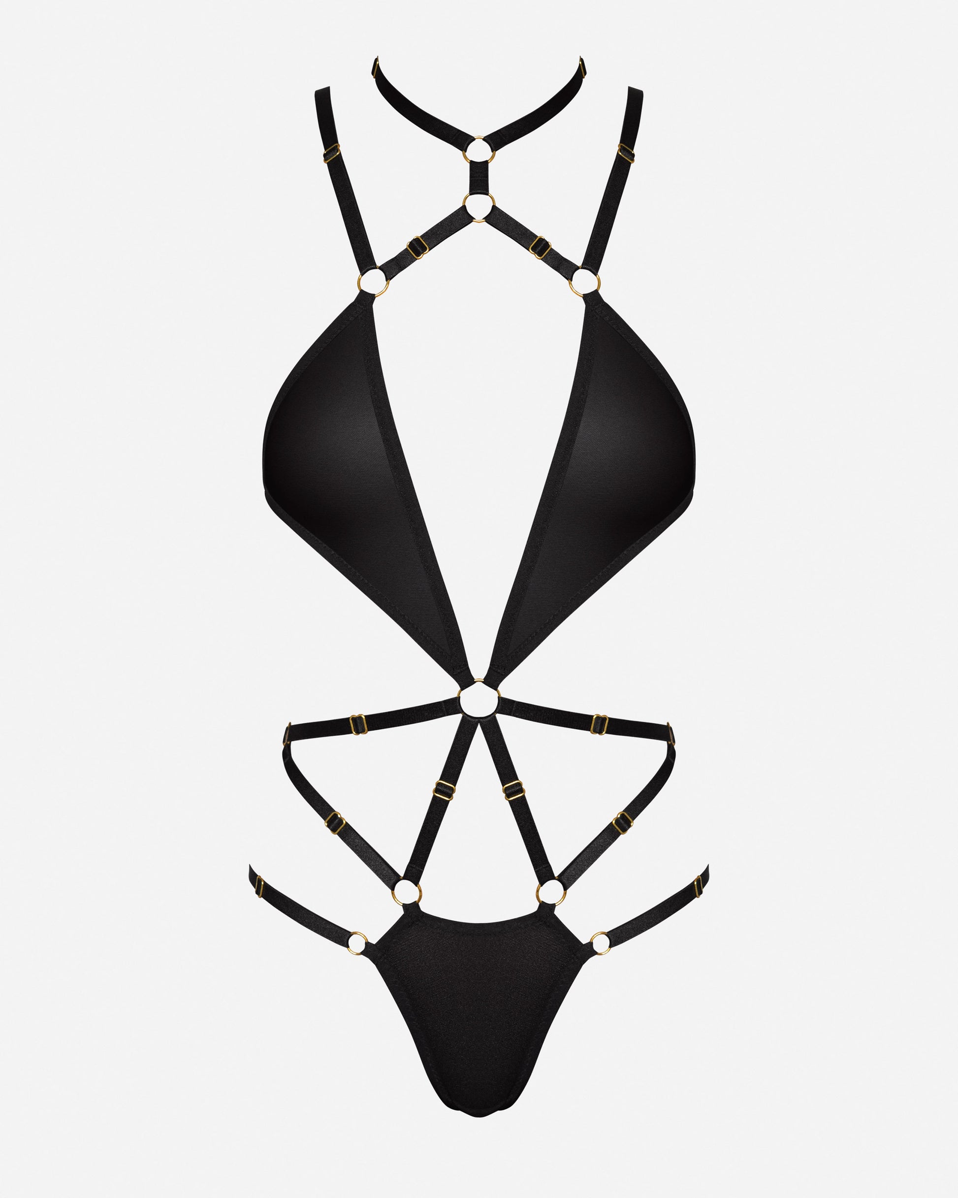 SANDRA Bodysuit by ROSANELLY™ is an ultra sexy and modern bodysuit made up of delicate soft mesh and elastic straps combined with 24k gold plated hardware that gently stretch and adjust over your hips. Fully adjustable with sliders.