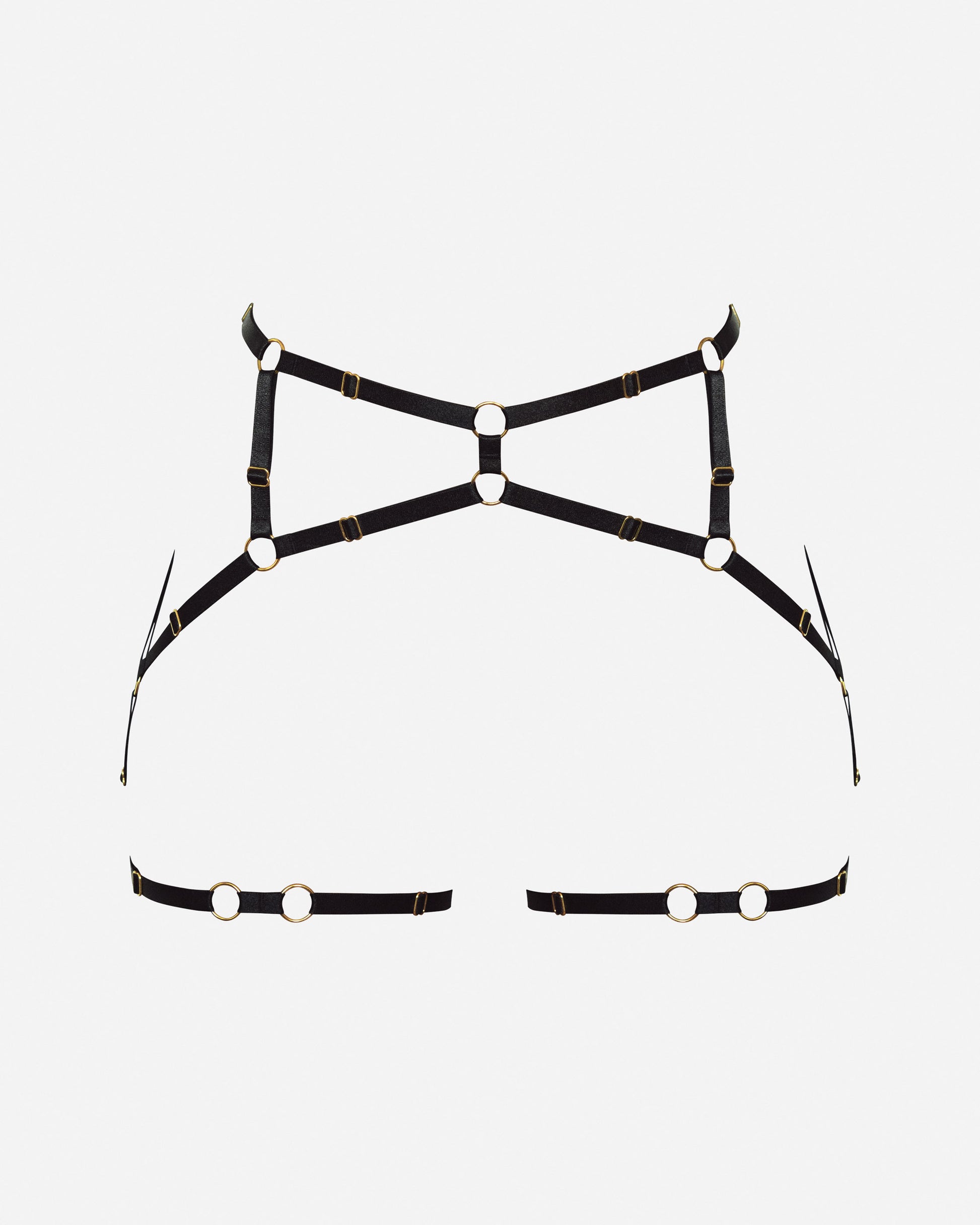 SARA Strap Suspender by ROSANELLY™ is a body harness made entirely of elastic satin strapping and 24k gold plated hardware. It looks perfect on its own or with your favourite ROSANELLY lingerie underneath.