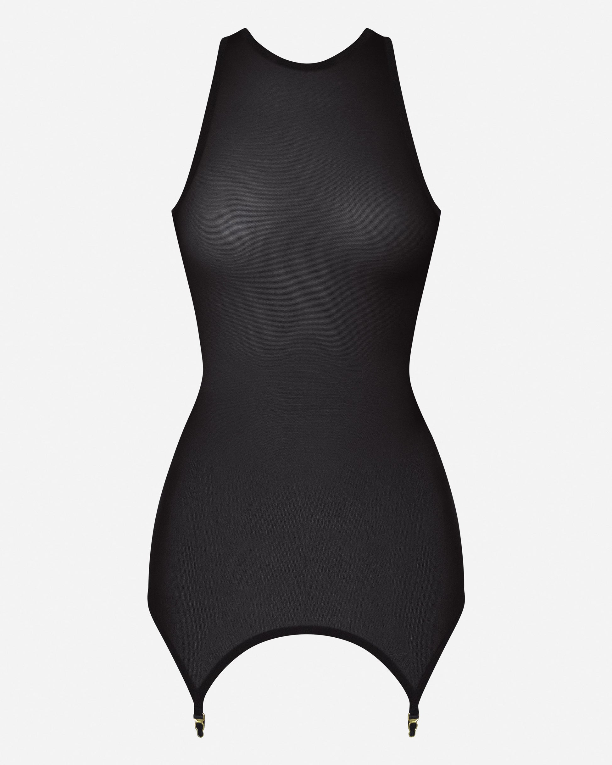 SARA Suspender Minidress by ROSANELLY™ is a high neck sleeveless minidress with suspenders. It's made with delicate soft mesh that gently stretches over your body.